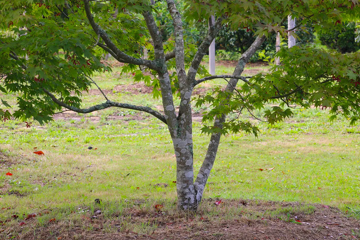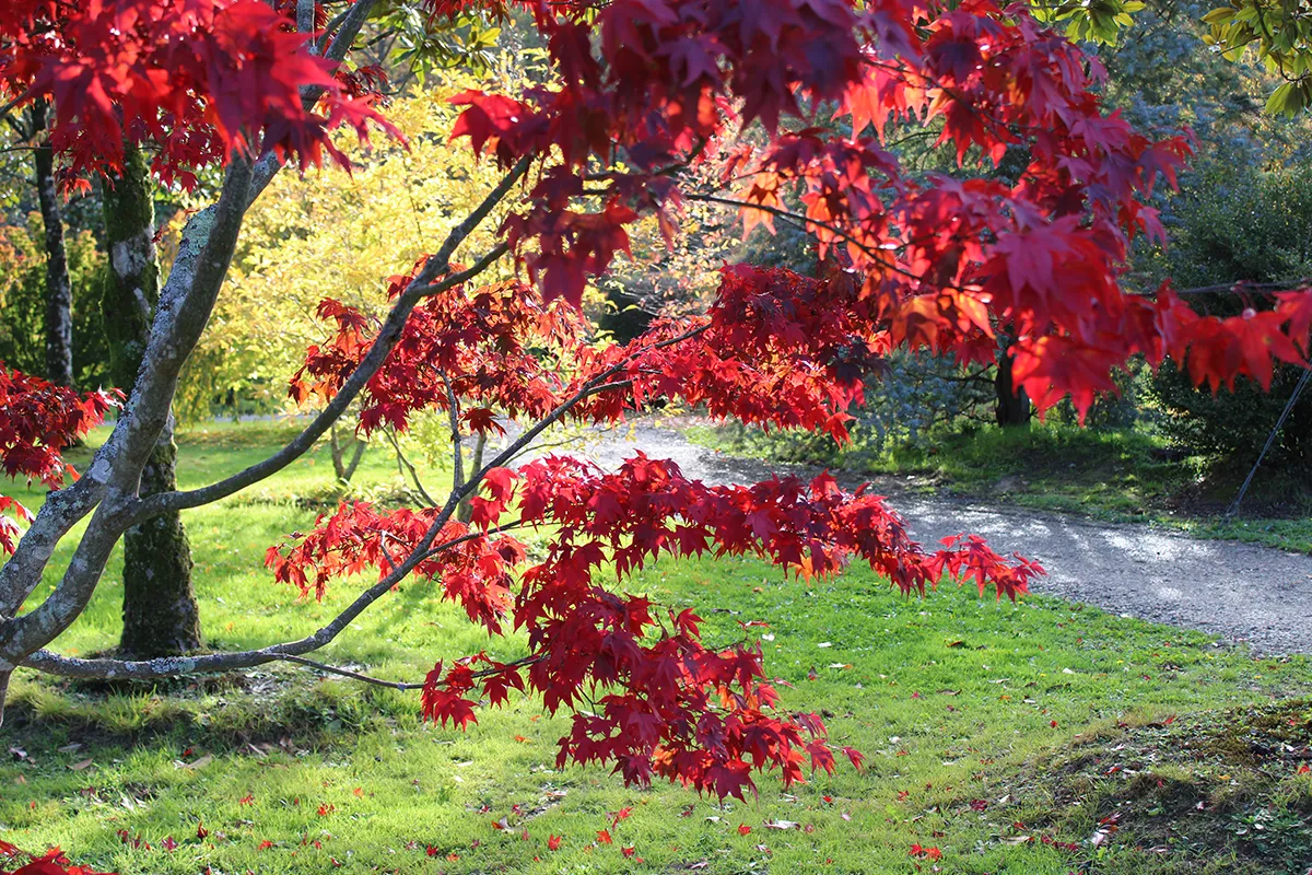 Très élégante silhouette japonisante pour cet érable asiatique au feuillage tout d’abord pourpre puis vert pourpré en été et finalement rouge écarlate à l’automne.