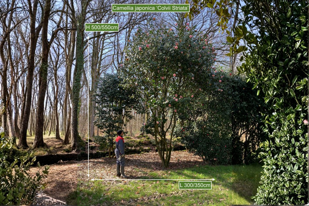 Ce spectaculaire camellia centenaire provient de la collection des célèbres pépinières Guichard à Nantes. La variété a été créé en 1843 en Belgique. Autre nom possible C.japonica ‘Lineata Alba’
