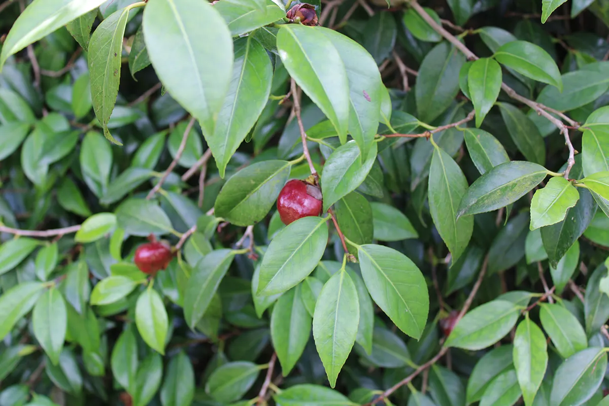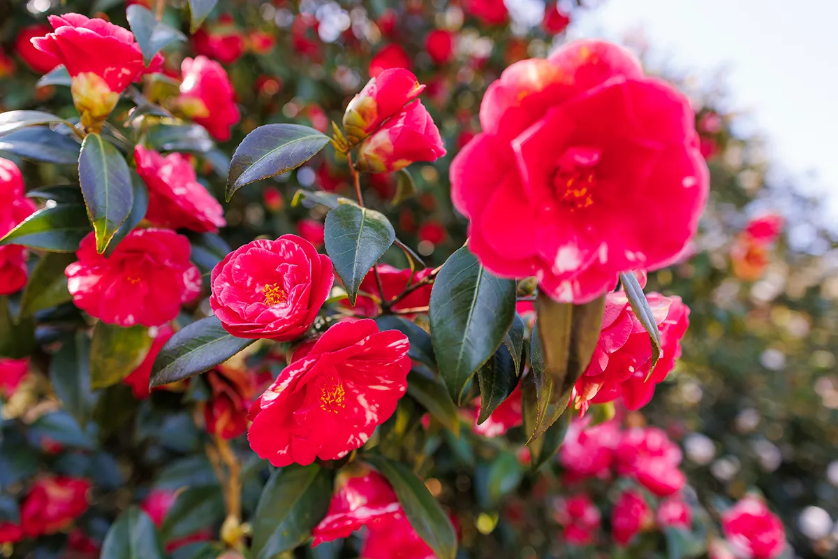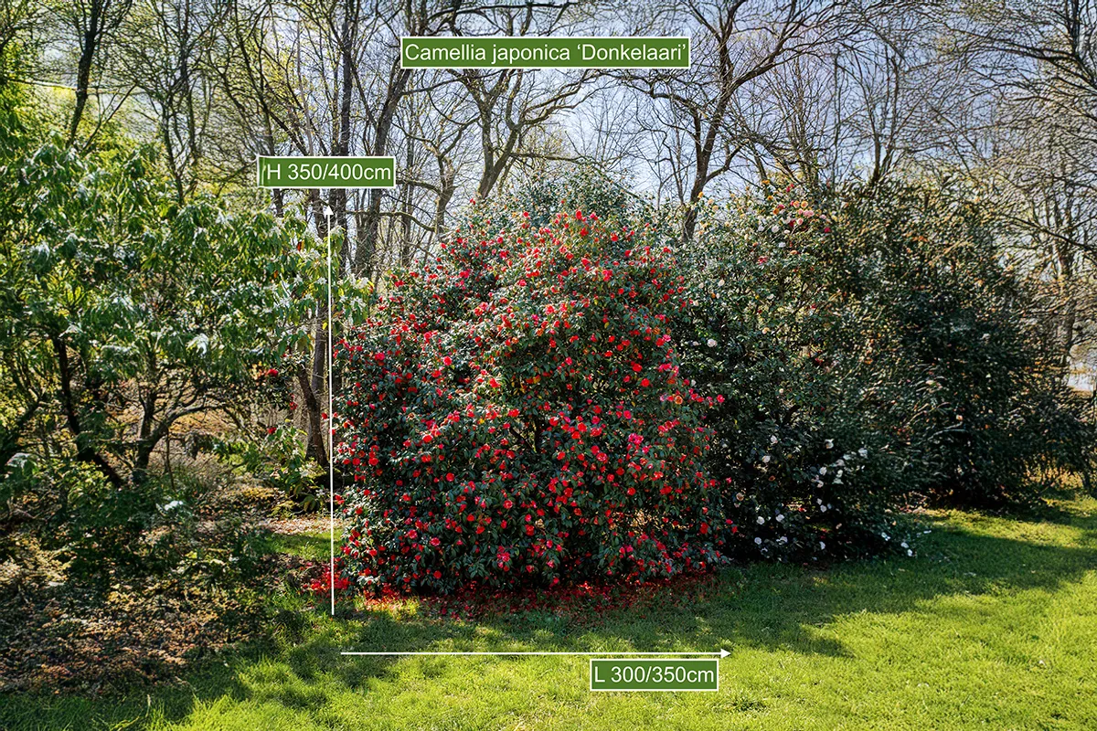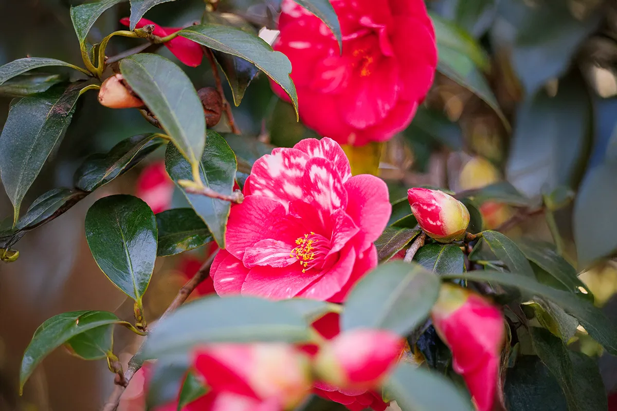 Longue durée de floraison pour ce Camellia centenaire provenant de la collection des célèbres Pépinières Guichard à Nantes . La variété a été créé en France en 1894 et ses fleurs sont rouges tachées de blanc.