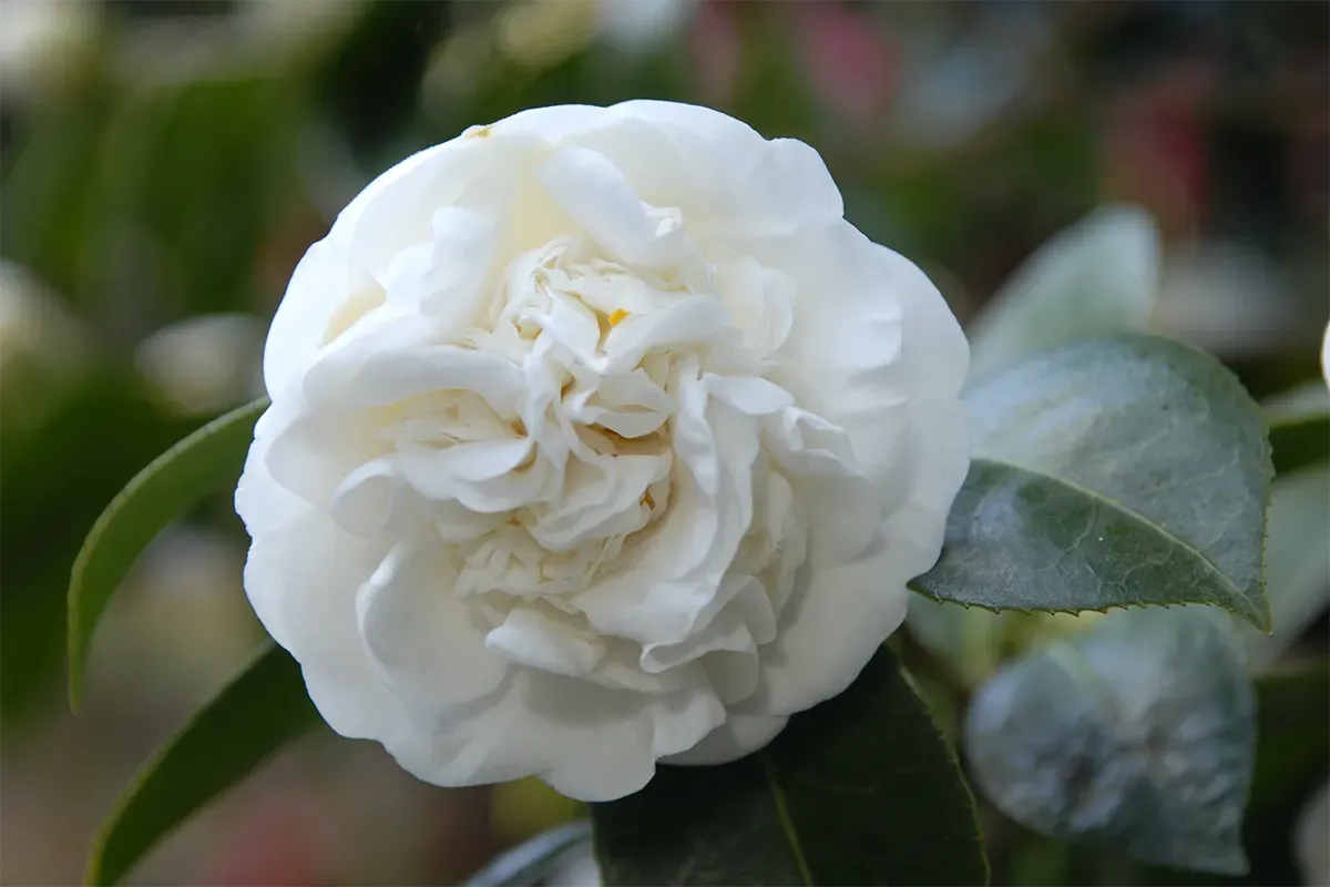 Ce Camellia centenaire provient de la collection des célèbres Pépinières Guichard à Nantes. Cette variété y a même été créée en 1920. Sa floraison dure plus de 2 mois. La fleur est de forme semi-double ou péoniforme.