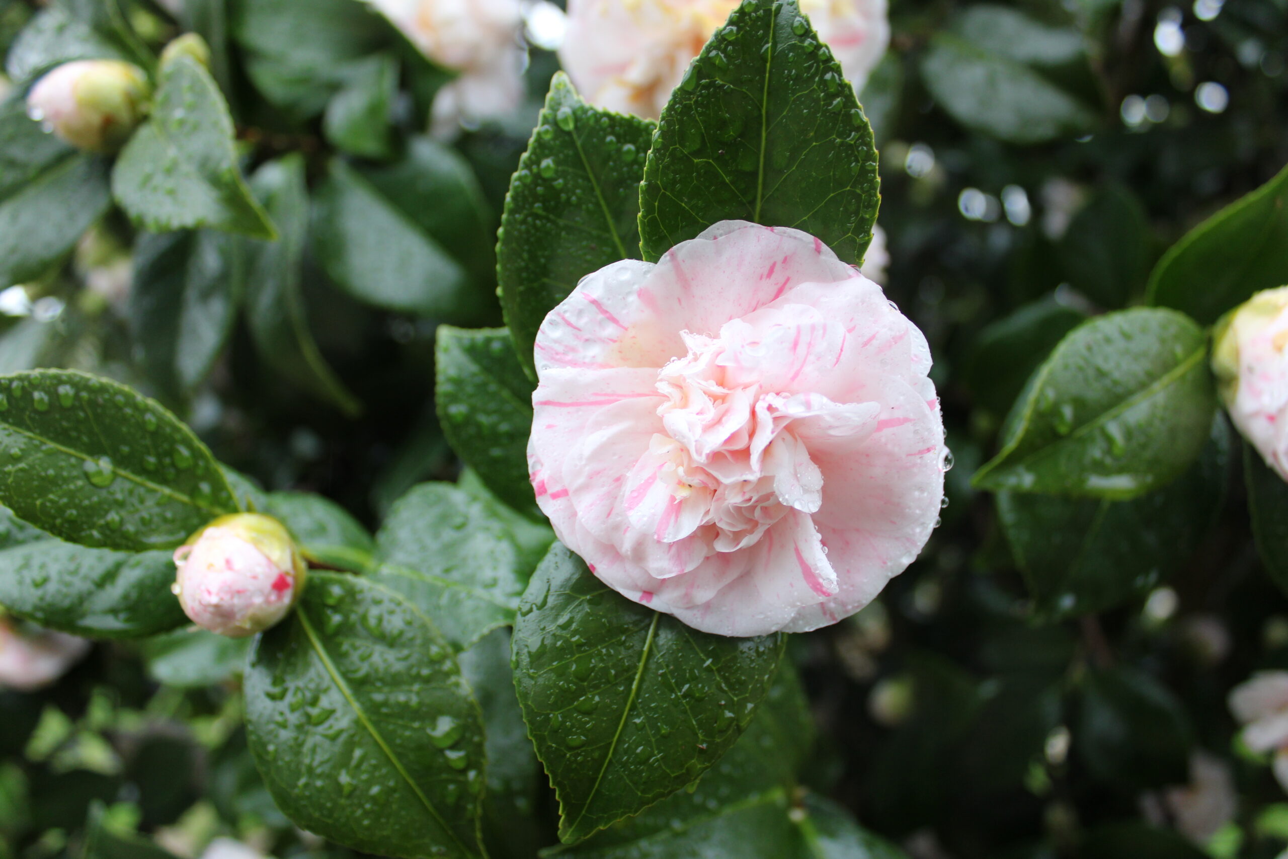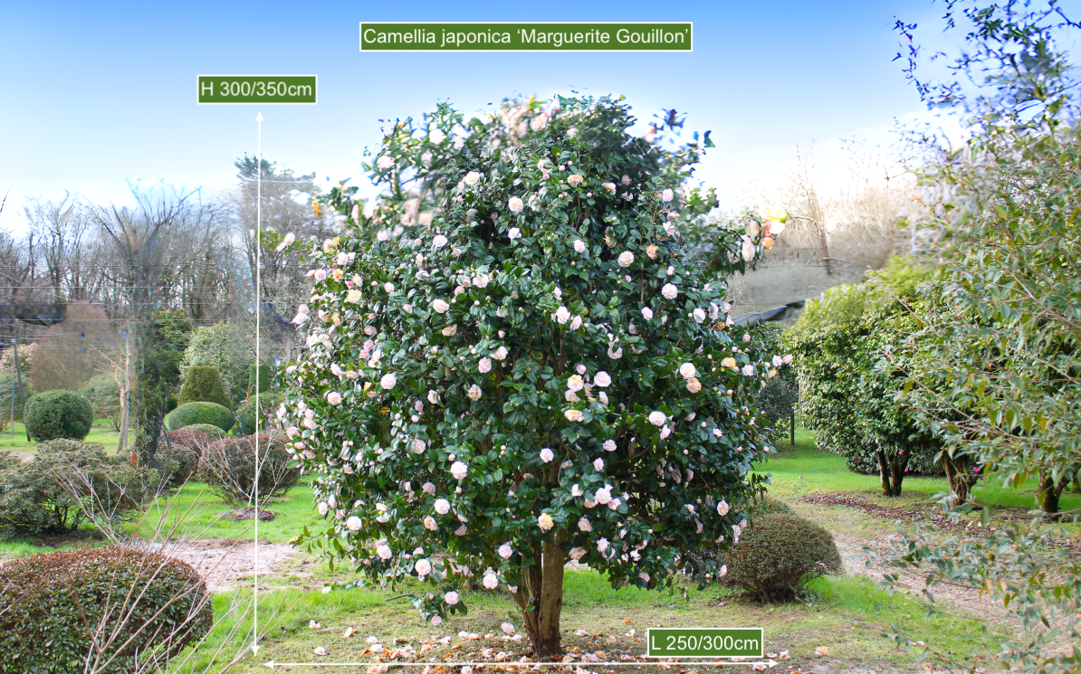 Très longue durée de floraison pour ce camellia japonica, à la silhouette érigée. Ses fleurs blanche striées de rose illuminent le jardin. La variété a été créée en France en 1840.