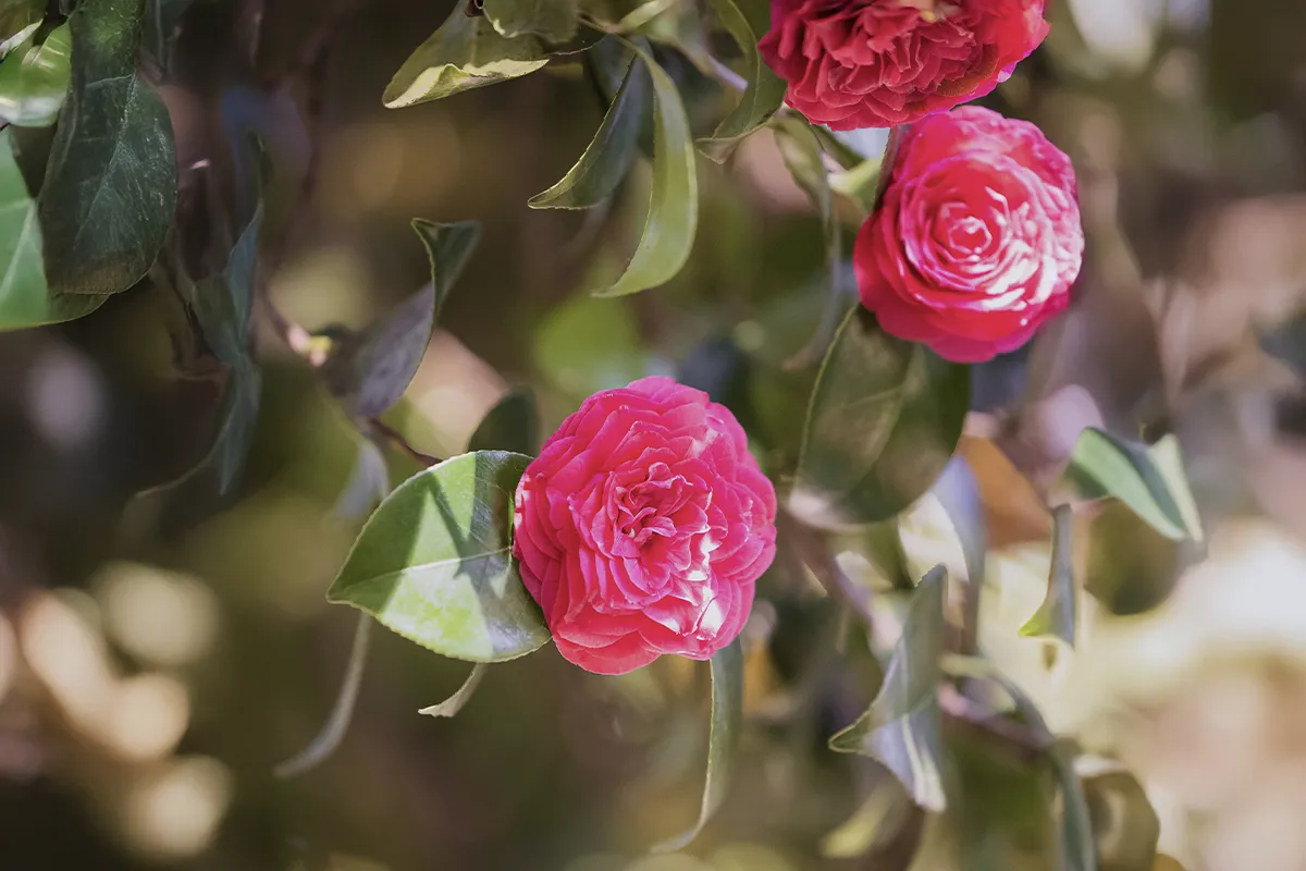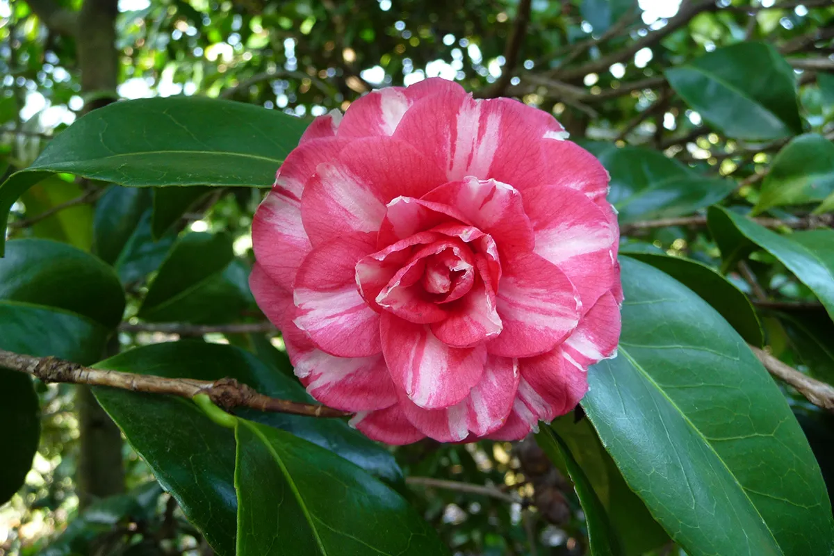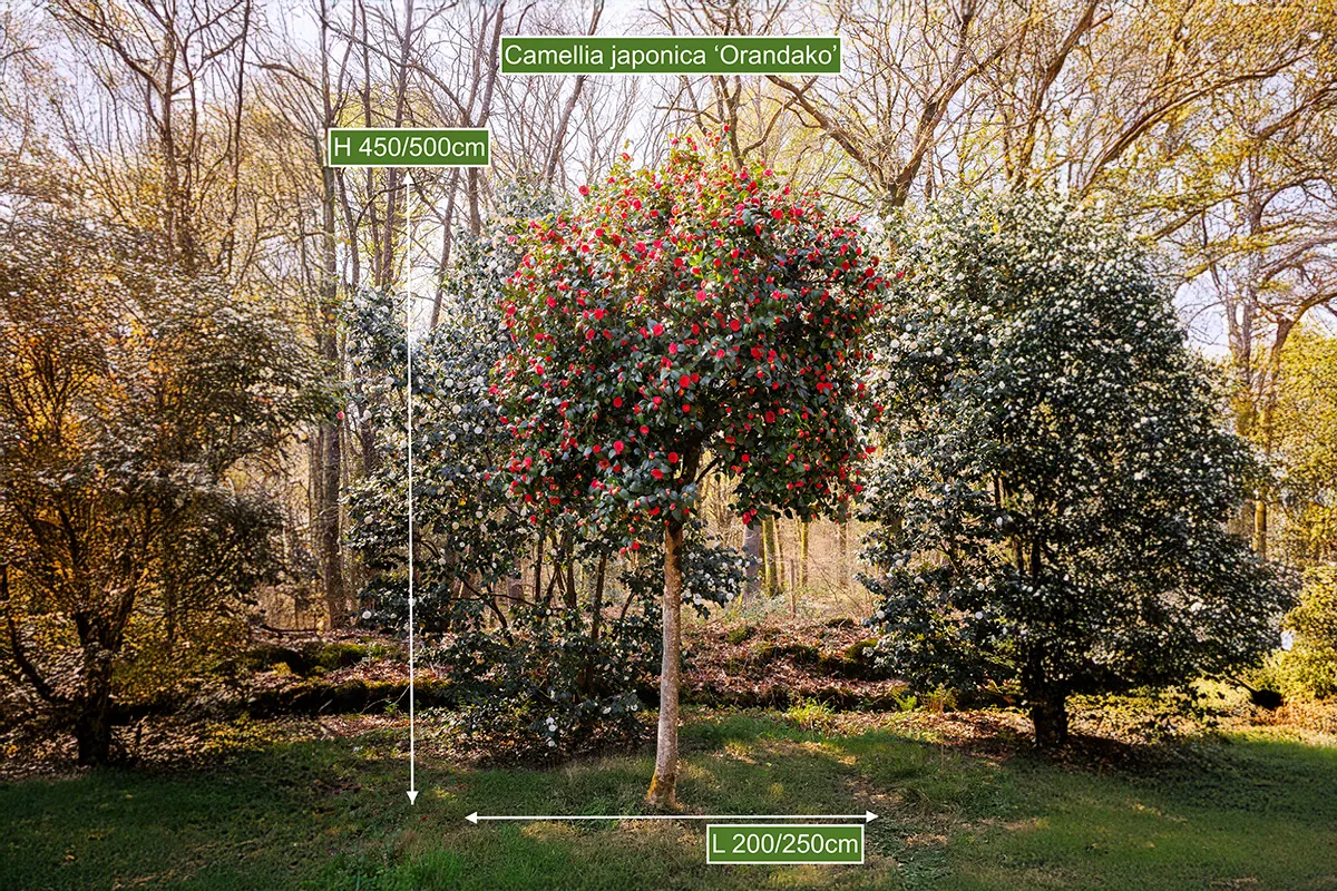 Sujet sur très haute tige , à la longue durée de floraison pour cette très ancienne variété de Camellia japonica créée au Japon en 1739. Ses fleurs sont très imbriquées et striées de blanc.