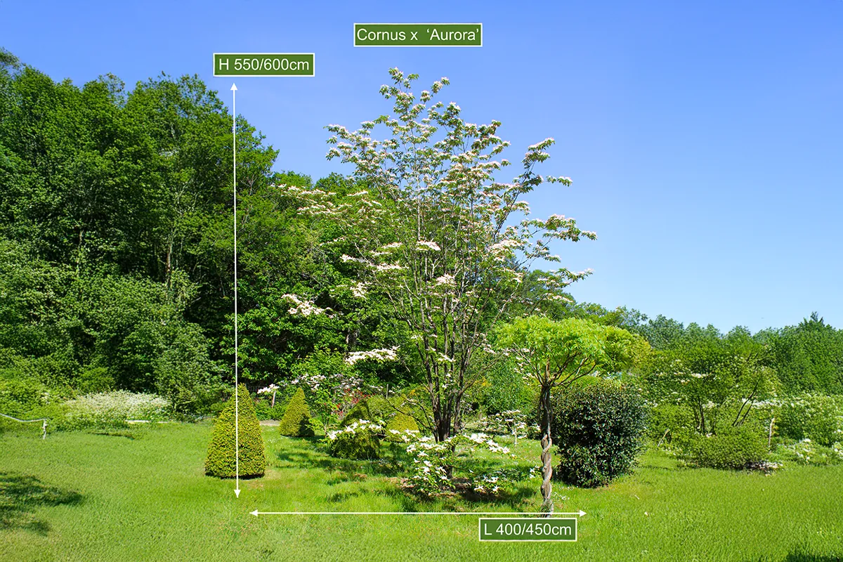 Les fleurs délicates et légèrement rosées de cet arbuste spectaculaire semblent voleter dans la ramure. Une vraie réussite pour cet hybride Cornus kousa x Cornus florida. Feuillage rouge éclatant à l’automne.