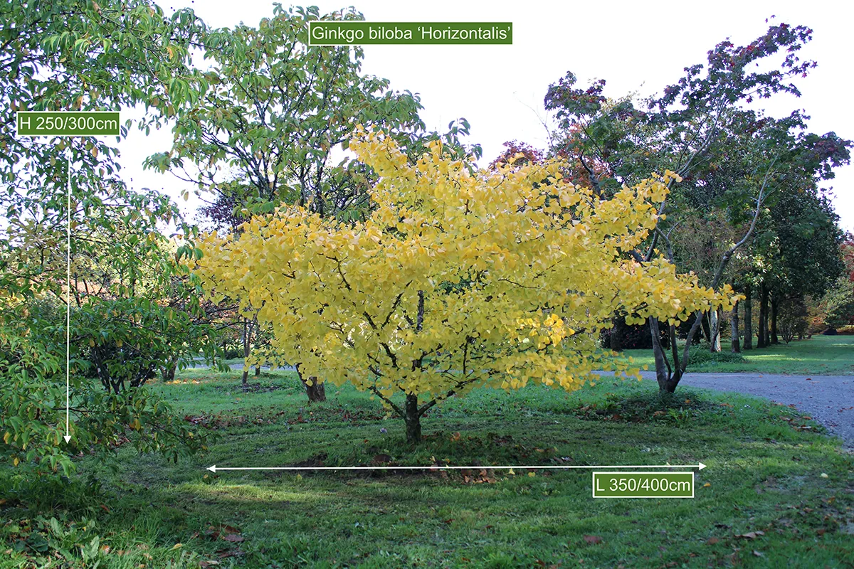 Rare arbuste d’environ 15 ans, ce Ginkgo biloba atteindra une largeur d’environ 6 mètres à l’age adulte.Cette variété plus petite que le type possède un joli port tabulaire, tout en offrant les couleurs d’automne jaune d’or légendaire de l’arbre au quarante écus.