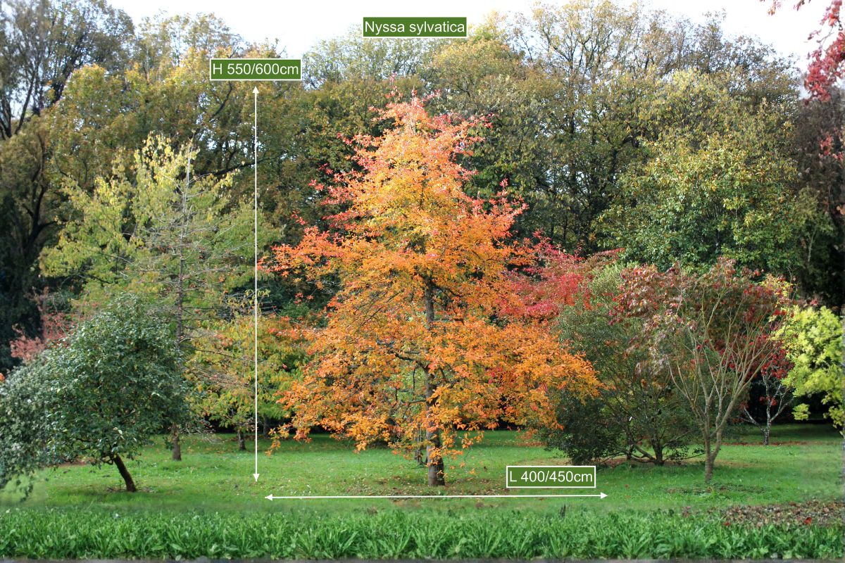 Également appelé Tupelo, mot amérindien signifiant « arbre des marais », le Nyssa sylvatica au port pyramidal prospère en sols frais. Ses feuilles de forme et de tailles variables sont d’un beau vert brillant qui à l’automne prend toute les teintes flamboyantes de l’été indien.