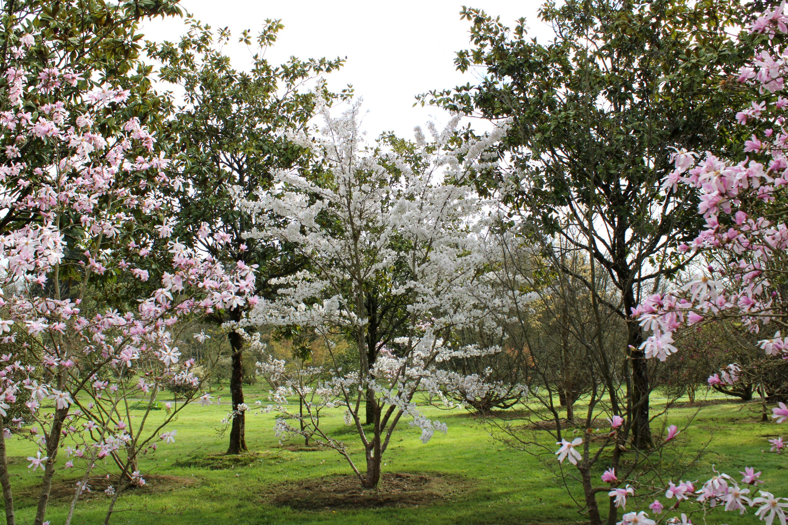 Cette variété emblématique de cerisier japonais au port étalé et à la floraison parfumée est ici conduite en cépée, sur plusieurs troncs.