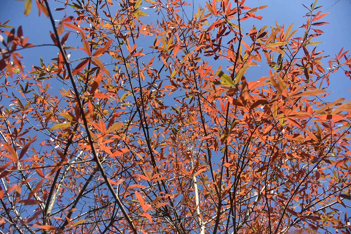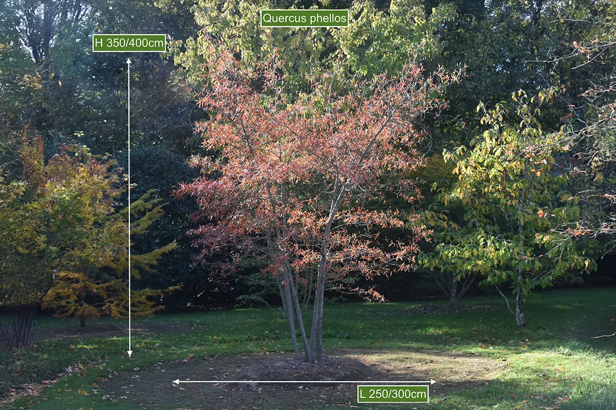 Ce chêne à feuilles de saule conduit en cépée, sur 4 troncs, se pare de belles couleurs rouges à l’automne.