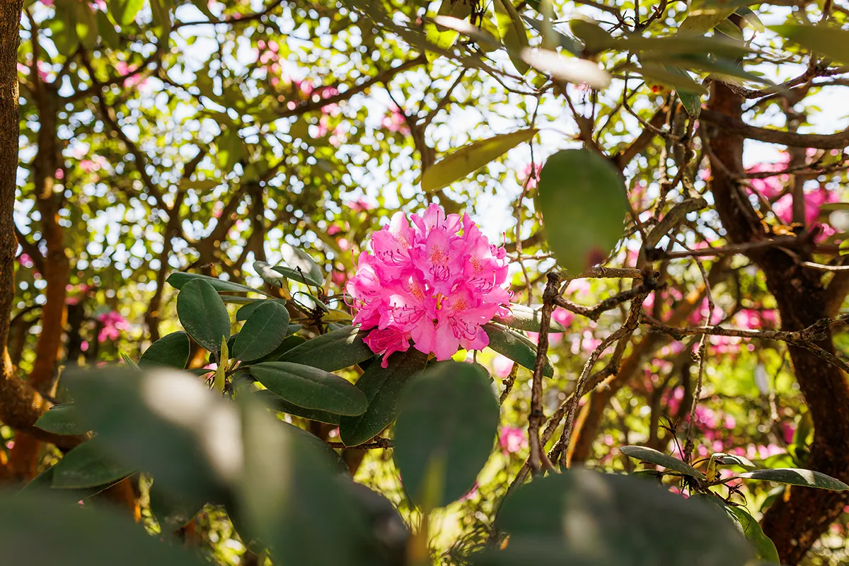 Très haut buisson couvert de grandes inflorescences roses soutenu en mai.