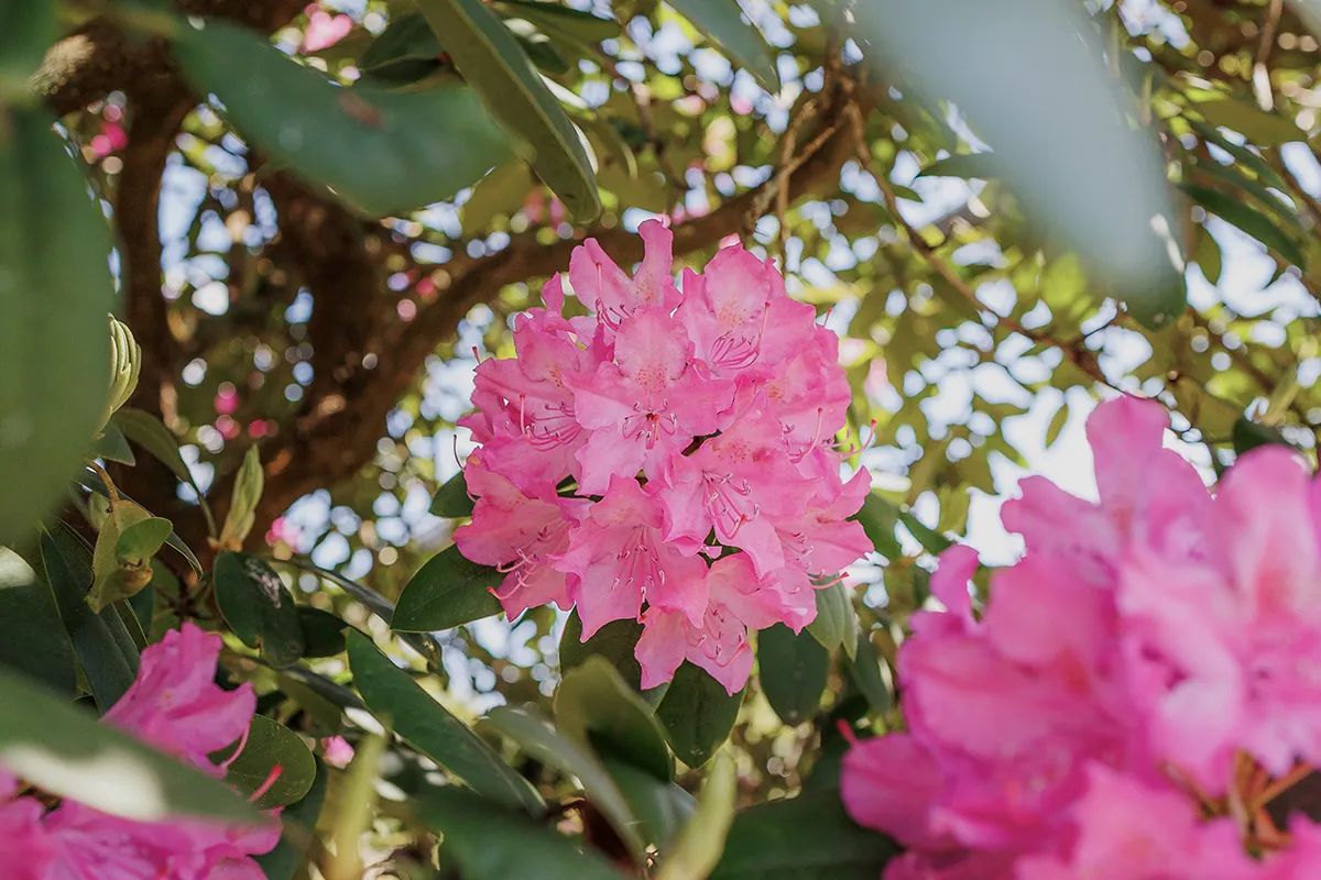 Très haut buisson couvert de grandes inflorescences roses soutenu en mai.