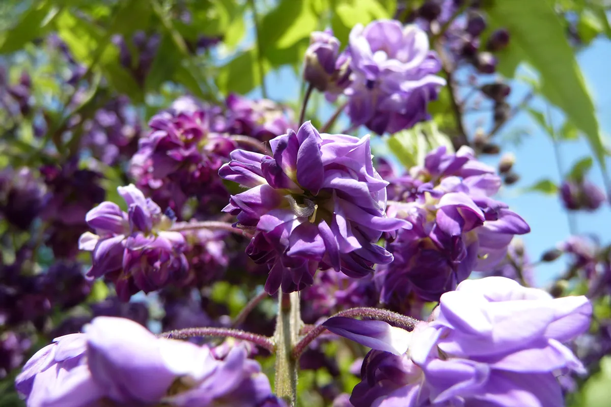 Glycine japonaise vigoureuse, très florifère, à très grandes fleurs doubles violet foncé d’environ 30 à 40cm de longueur et légèrement parfumées. Un sujet d’environ 15/18 ans , au tronc droit et élancé.
