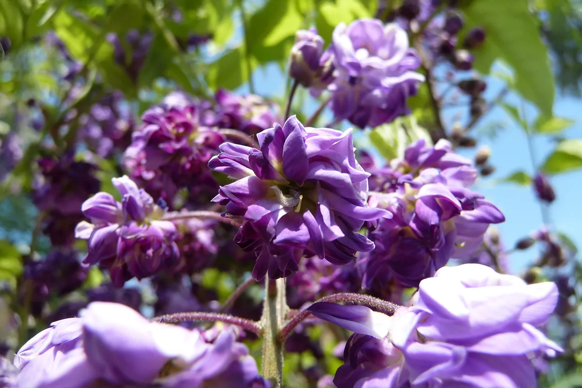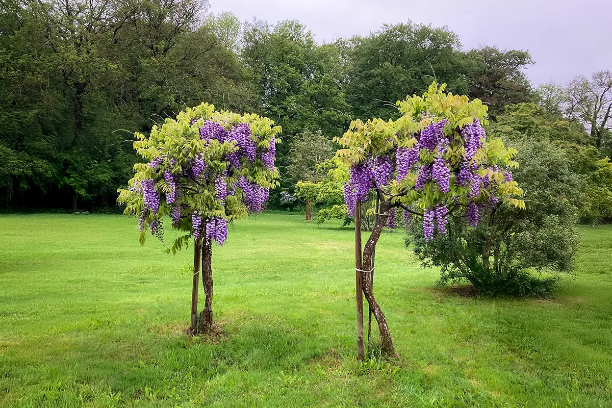 Glycine japonaise vigoureuse, très florifère, à très grandes fleurs doubles violet foncé d’environ 30 à 40cm de longueur et légèrement parfumées. Un sujet d’environ 15/18 ans , au double tronc tressé.