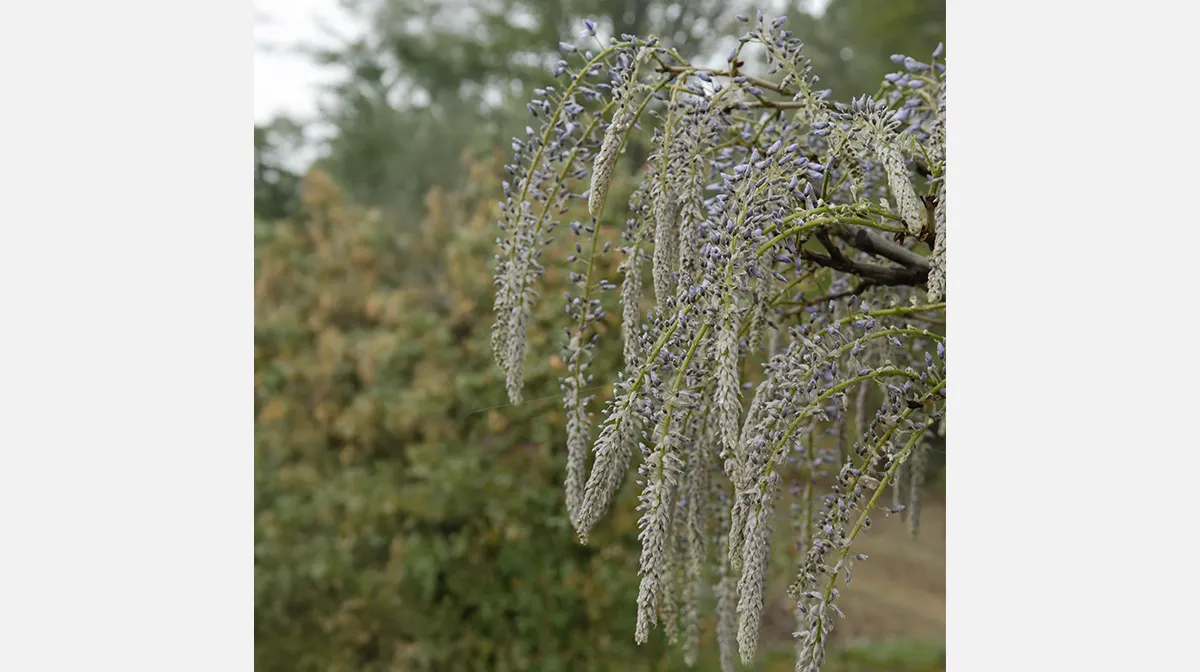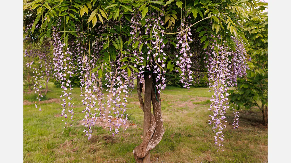 Très belle glycine japonaise, vigoureuse, florifère et parfumée.Ses très longues fleurs mauve mesurent jusqu’à 100cm.Sujet de 20/25 ans conduit sur 2 troncs torsadés.